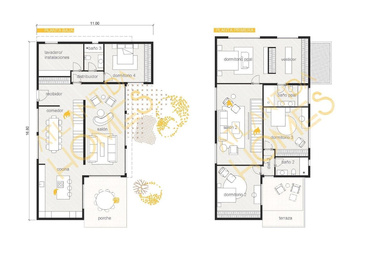 En la planta baja, la entrada conduce a un recibidor, con armario empotrado, que conecta con el luminoso salón-comedor. A la izquierda, un distribuidor da acceso a un dormitorio, un baño y un práctico cuarto de lavadero. La cocina abierta al estar conectada con el comedor, se convierte en un espacio fluido y funcional, mientras que, desde el salón, se accede a un acogedor porche que amplía la vivienda hacia el exterior. Al subir a la primera planta, un segundo salón actúa como distribuidor hacia la habitación principal, que cuenta con vestidor y baño en suite. Además, en esta planta encontramos dos dormitorios adicionales que comparten un baño y una gran terraza, ideal para disfrutar del aire libre.