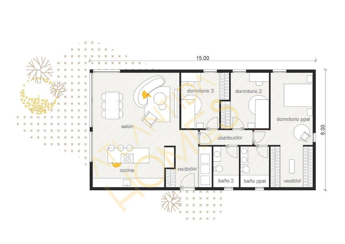 La casa TERRA está diseñada para aprovechar al máximo cada espacio, ofreciendo la comodidad y funcionalidad de vivir en una sola planta.