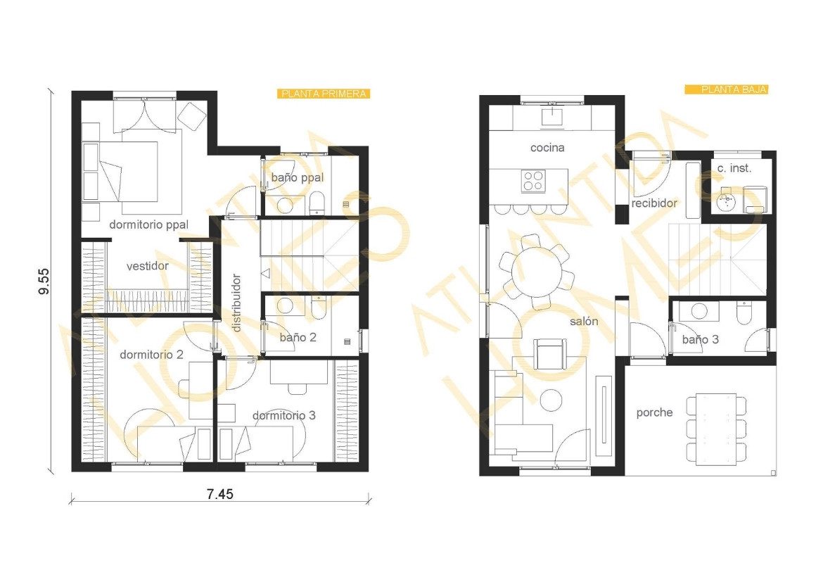 Respecto a la planta baja, el Atlas de cuatro dormitorios incluye, además del recibidor, cuarto de instalaciones, distribuidor, salón, cocina y aseo, un cuarto dormitorio adicional. Sin embargo, en el Atlas de tres dormitorios, este espacio se transforma en un porche exterior, perfecto para disfrutar del jardín.